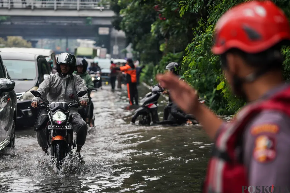 Sejumlah kendaraan melintasi genagan banjir di Jalan DI Panjaitan, Cawang, Jakarta Timur, Kamis, 22 Januari 2025. (Sumber: Poskota/Bilal Nugraha Ginanjar)