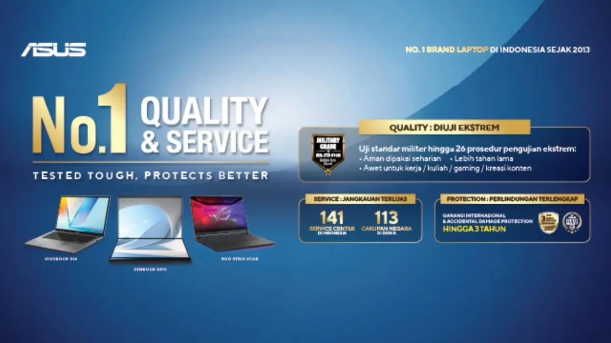 Terhitung mulai 1 Januari 2026, ASUS secara resmi memberlakukan peningkatan standar layanan purna jual yang mencakup tiga pilar keunggulan, yakni kualitas produk yang teruji secara ekstrem, perlindungan purna jual yang paling komprehensif, serta jangkauan layanan servis terluas di seluruh pelosok negeri.