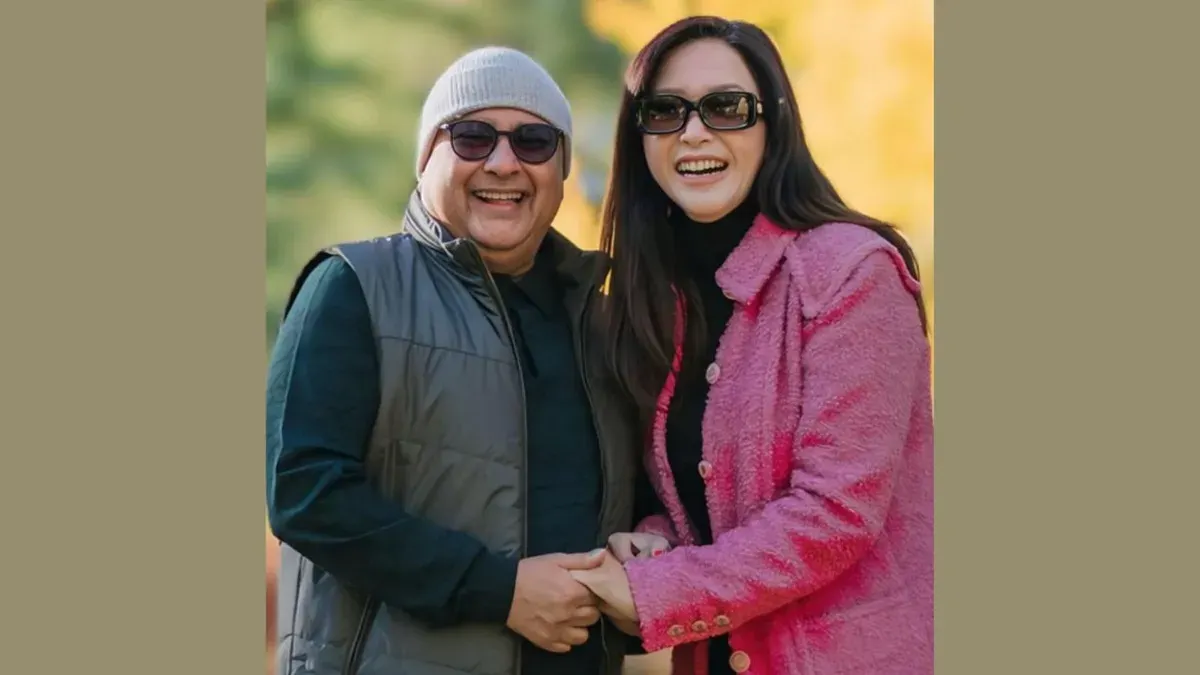 Keduanya tampak berdiri berdampingan sambil bergandengan tangan dan tersenyum hangat ke arah kamera, memancarkan keharmonisan rumah tangga.