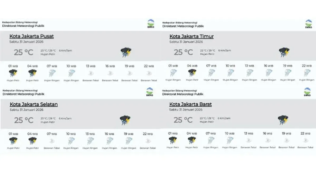 Berikut rincian prakiraan cuaca Jakarta pada Sabtu, 31 Januari 2026, berdasarkan klasifikasi intensitas hujan: