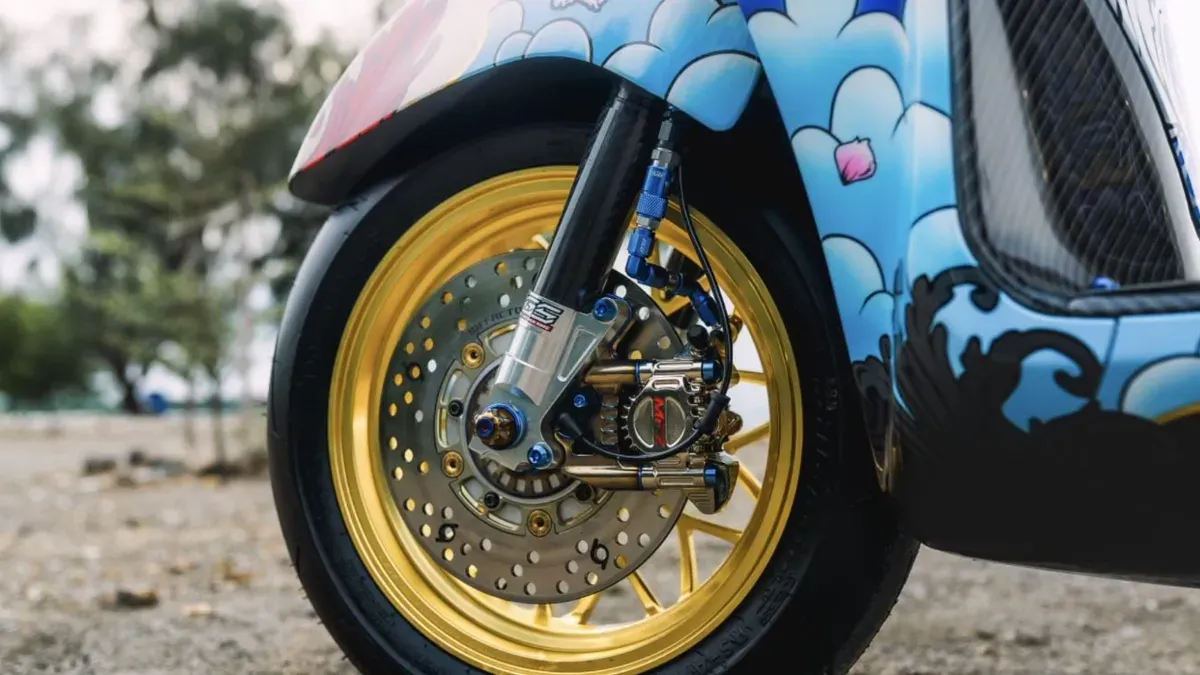 Berbeda dari tren modifikasi skutik yang sedang populer di kalangan anak muda, Blastoise memilih konsep sporty dengan sentuhan budaya Jepang. Inspirasi utama datang dari helm sporty bertema Motegi, yang kemudian diterjemahkan ke dalam visual grafis motor.