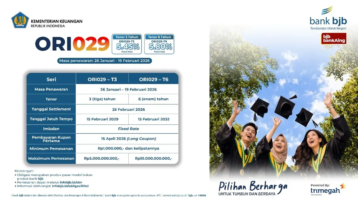 Masa penawaran ORI029 berlangsung mulai 26 Januari hingga 19 Februari 2026. Selama periode tersebut, masyarakat yang sudah memiliki rekening efek bank bjb dapat melakukan pemesanan melalui website infobjb.id/sbn yang dapat diakses kapan saja dan dari mana saja.