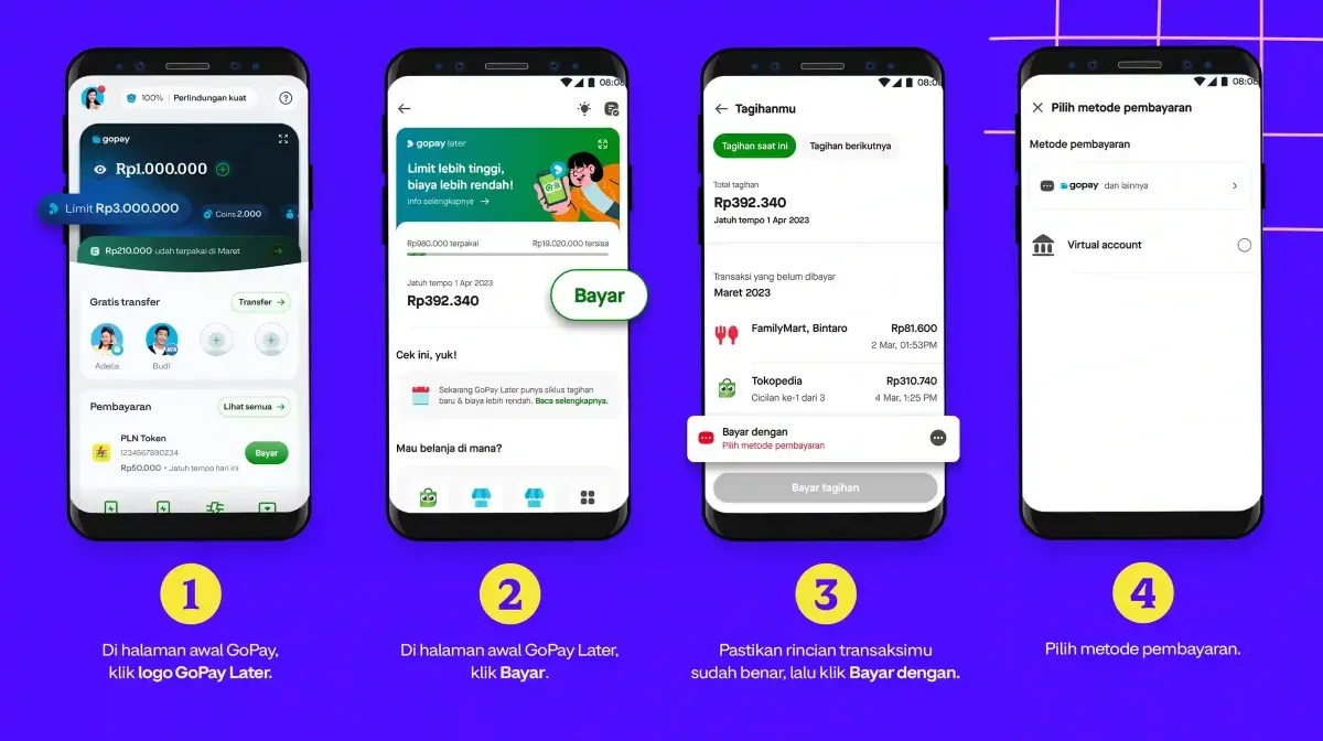 GoPay Later merupakan fasilitas pembiayaan “beli sekarang, bayar nanti” yang dapat digunakan di ekosistem Gojek, GoPay, dan Tokopedia. Pengguna bisa bertransaksi menggunakan limit kredit yang disediakan, lalu melunasi tagihan di akhir periode atau melalui cicilan bulanan.