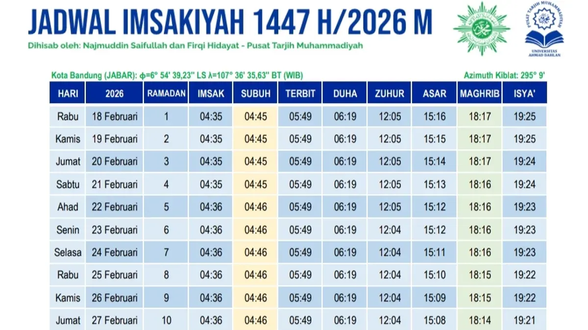 Berikut ini jadwal imsakiyah puasa Ramadhan 2026 khusus Kota Bandung yang disusun oleh Muhammadiyah.