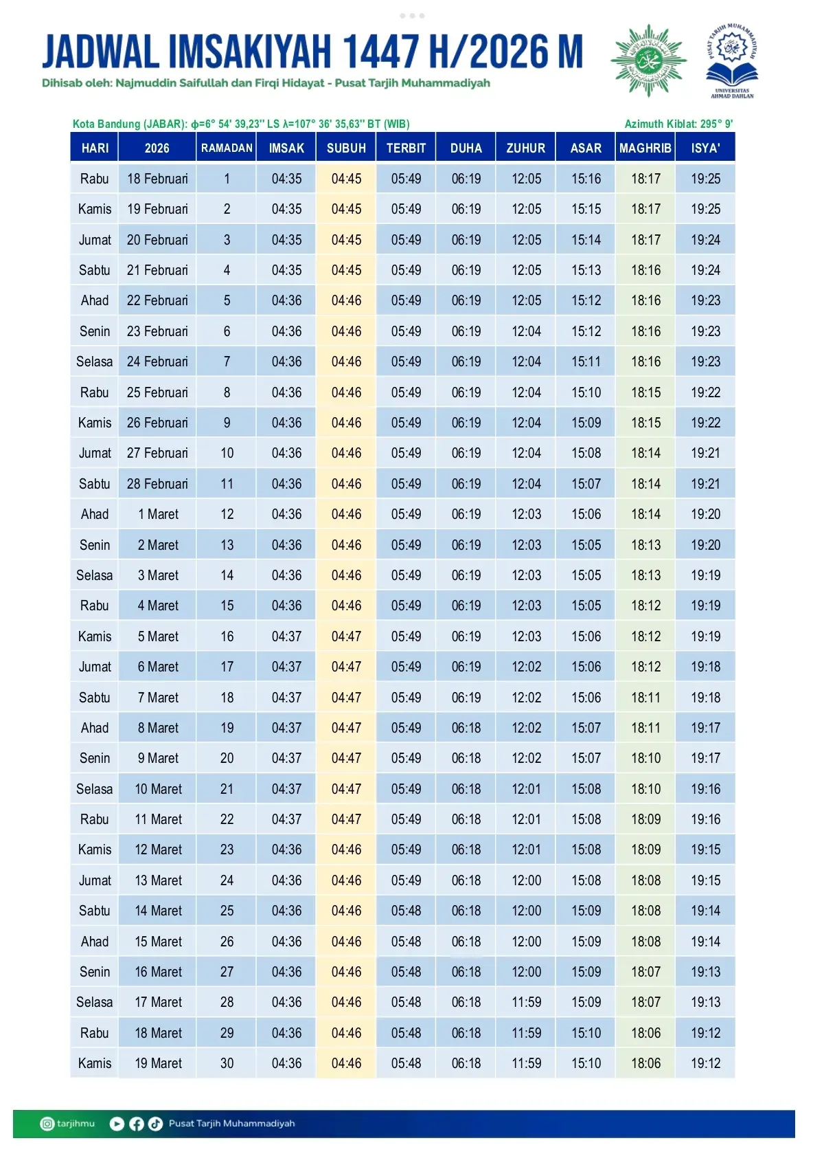 Pusat Tarjih Muhammadiyah resmi merilis jadwal Imsakiyah seluruh daerah yang ada di Indonesia, termasuk Kota Bandung dan sekitarnya .