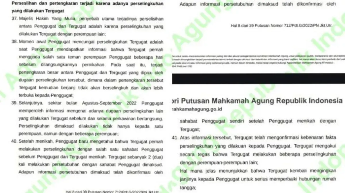 "Penyebab utama terjadinya perselisihan antara Penggugat dan Tergugat adalah karena perselingkuhan yang dilakukan Tergugat dengan perempuan lain," demikian isi dalam gugatan tersebut.