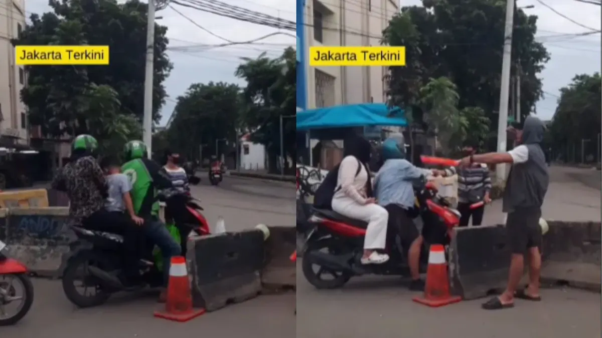 Dalam video yang diunggah Instagram @jakarta.terkini, dua orang terlihat memalak pengendara motor supaya bisa melewati jalan yang ditutup barikade beton.