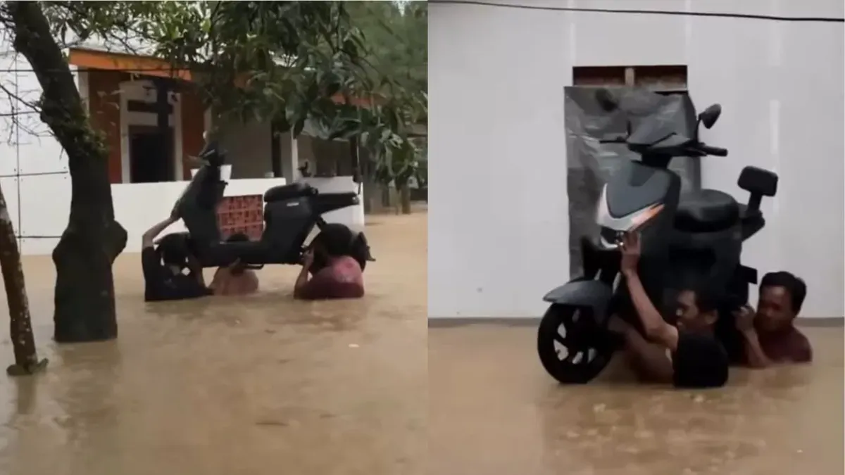 Sejumlah warga Citeureup Pandeglang saat evakuasi speda motor dalam kondisi banjir. (Sumber: Dok. Warga)