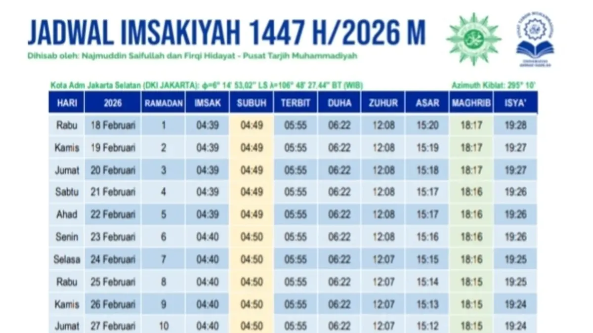 Jadwal imsakiyah Ramadhan 2026 kota Jakarta Selatan. (Sumber: Pusat Tarjih Muhammadiyah)