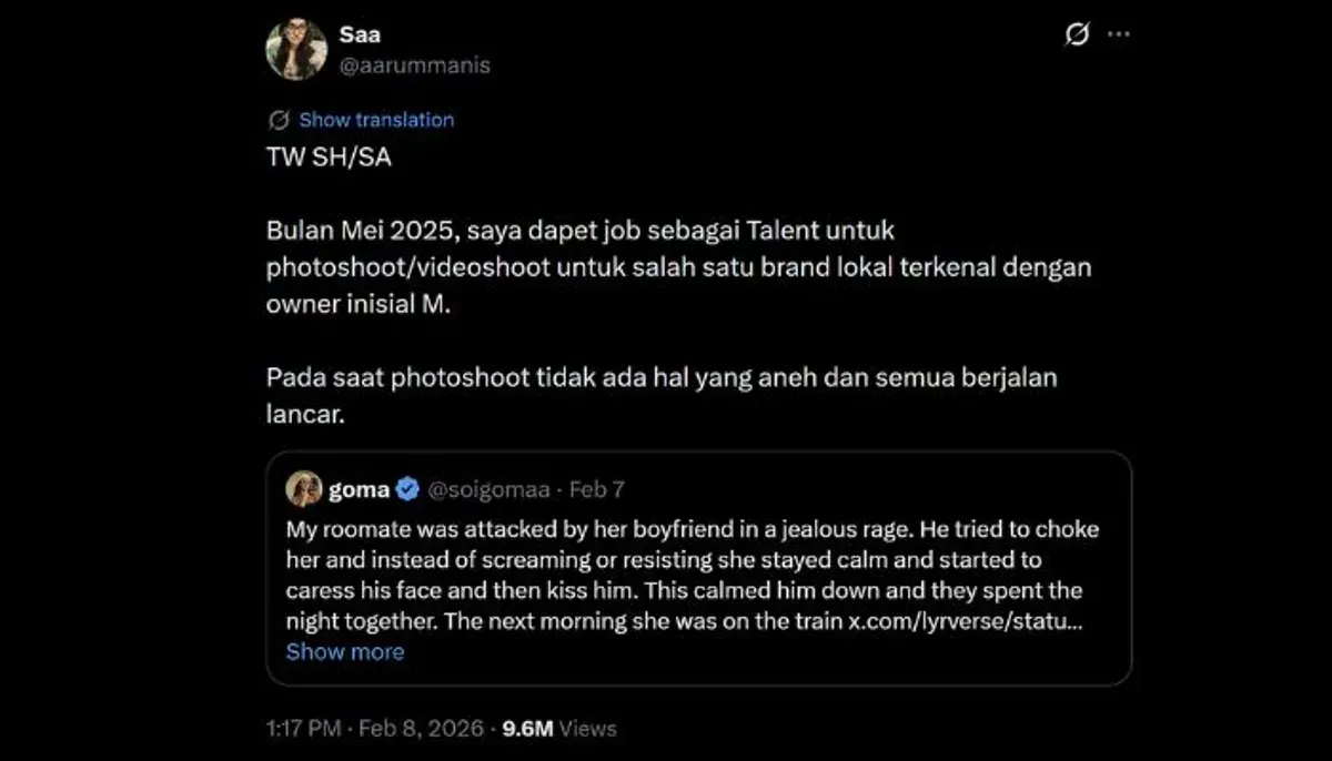 “Bulan Mei 2025, saya dapet job sebagai Talent untuk photoshoot/videoshoot untuk salah satu brand lokal terkenal dengan owner inisial M. Pada saat photoshoot tidak ada hal yang aneh dan semua berjalan lancar,” tulis Saa yang dikutip Poskota pada, 9 Februari 2026.
