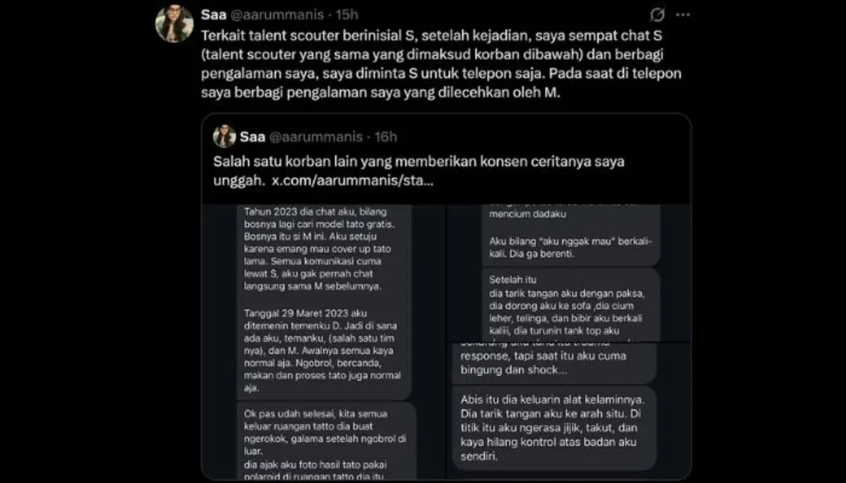 Pengakuan tersebut dibagikan korban melalui akun X miliknya @aarummanis, memicu diskusi luas terkait privasi korban serta proses penyelesaian kasus yang tengah berjalan.