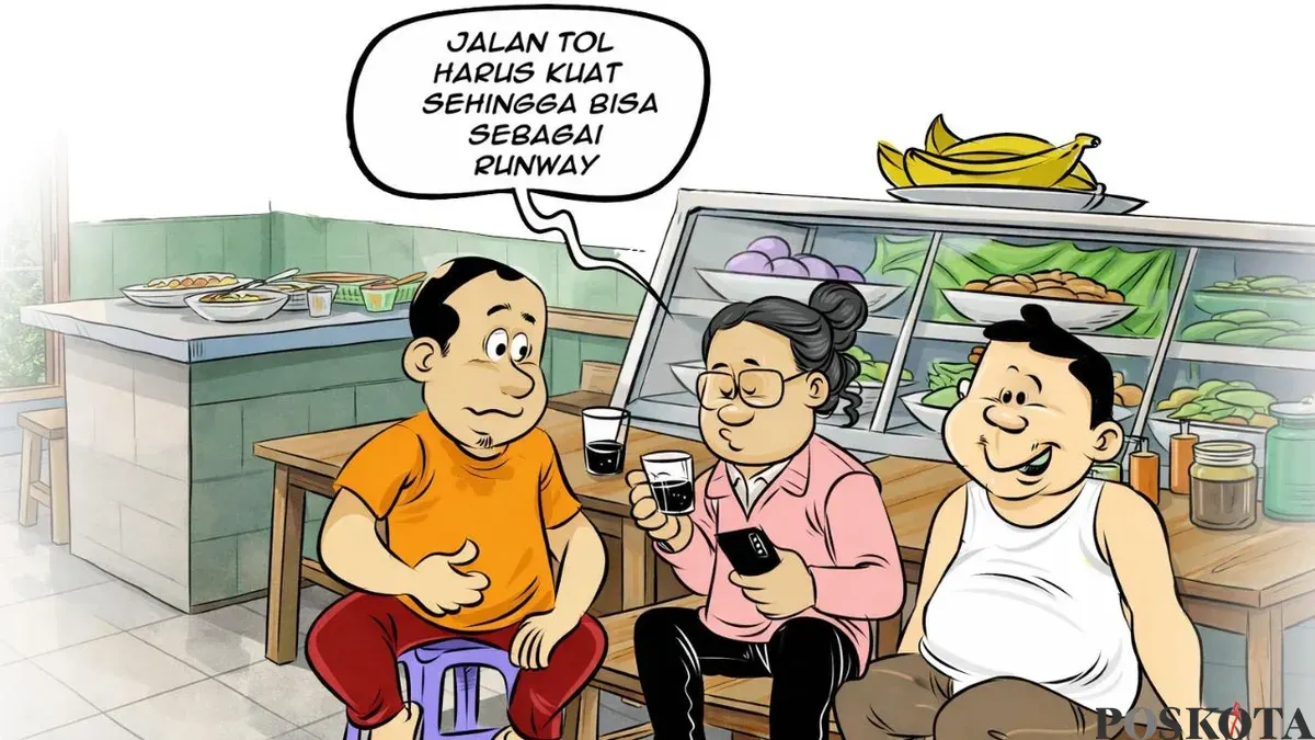 “Berrati jalan tolnya harus kuat sehingga bisa sebagai runway, landasan pacu pesawat tempur baik saat landing maupun mengudara,” ujar Heri kepada mas Bro dan Yudi dalam sesi obrolan warteg.