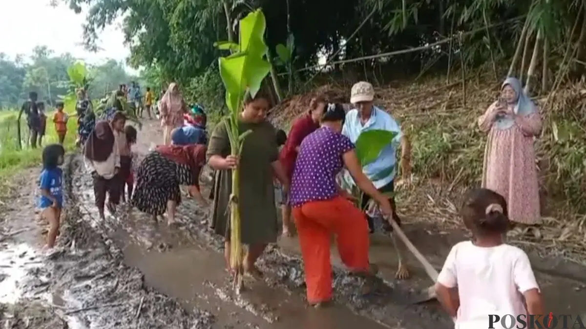 LEBAK, POSKOTA.CO.ID - Warga menanam pohon pisang di jalan rusak, Kampung Parung, Desa Intenjaya, Kacamata Cimarga, Kabupaten Lebak, Jumat, 13 Februari 2026.