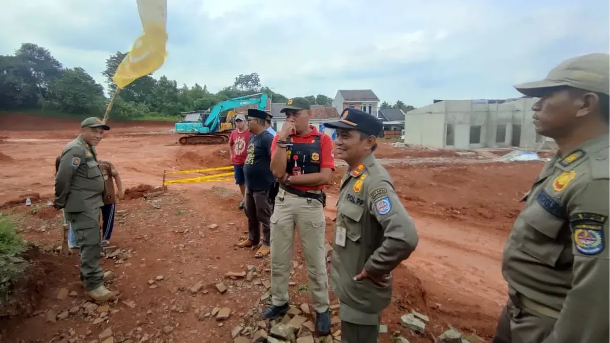 DEPOK, POSKOTA.CO.ID - Satuan Polisi (Satpol) Pamong Praja (PP) Kota Depok menghentikan galian tanah untuk pendirian bangunan rumah di RW 03, Kelurahan Bedahan, Kecamatan Sawangan.