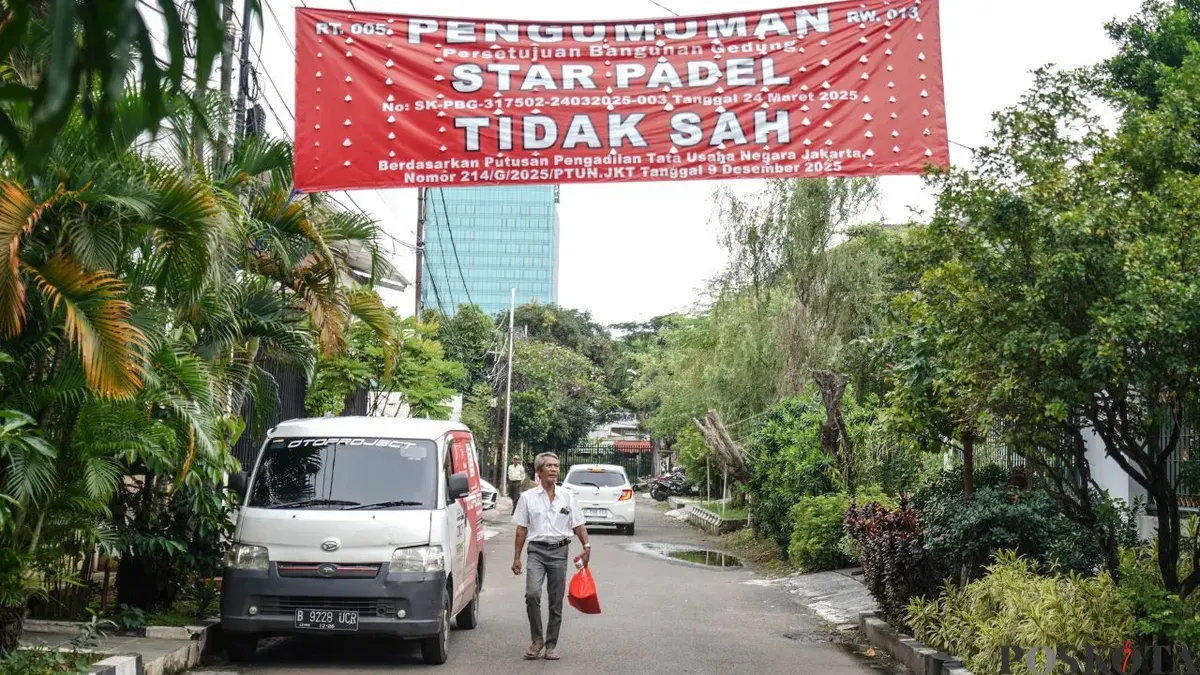 Spanduk Penolakan Lapangan Padel di Pulomas, Jakarta Timur, Minggu, 22 Februari 2026. (Sumber: Poskota/Bilal Nugraha Ginanjar)