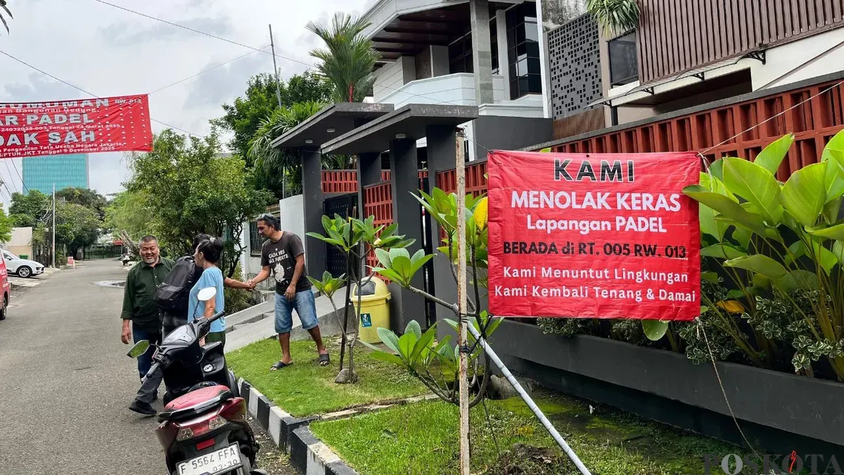 Sementara itu, pantauan langsung Poskota di lokasi, tampak ada spanduk yang dipasang warga pada jalan menuju lapangan padel bertuliskan ‘Kami Menolak Keras Lapangan Padel Berada di RT 05 RW 13. Kami Menuntut Lingkungan Kami Kembali Tenang dan Damai’.