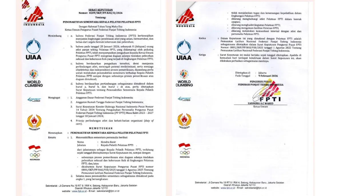 "Bahwa pada tanggal 28 Januari 2026, sebanyak 8 (delapan) orang atlet panjat tebing, Pelatnas FPTI, yang didampingi oleh psikolog Pelatnas FPTI, telah menyampaikan pengaduan kepada Ketua Umum Pengurus Pusat FPTI mengenai dugaan adanya tindakan pelecehan seksual dan kekerasan fisik yang terjadi di lingkungan Pelatnas FPTI," demikian yang tertuang dalam surat keputusan tersebut.
