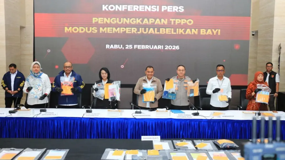 Jumpa pers Direktorat Tindak Pidana PPA serta TPPO Bareskrim Polri terkait praktik perdagangan orang dengan modus jual beli bayi, Rabu, 25 Februari 2026. (Sumber: Dok. Bareskrim Polri)