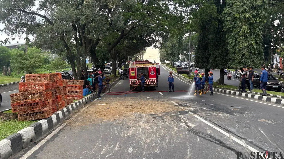 Petugas Damkar melakukan pembersihan ruas jalan Tegar Beriman, Cibinong, Kabupaten Bogor usai kejadian truk ayam terguling pada Rabu, 25 Februari 2026. (Sumber: Poskota/Giffar Rivana)