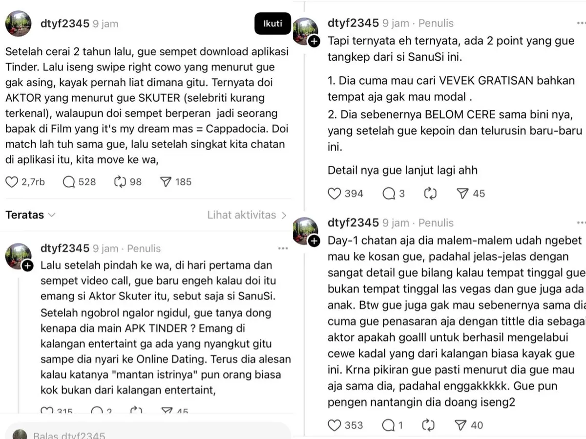 "Setelah cerai 2 tahun lalu, gue sempet download aplikasi Tinder. Lalu iseng swipe right cowo yang menurut gue gak asing, kayak pernah liat dimana gitu. Ternyata doi AKTOR yang menurut gue SKUTER (selebriti kurang terkenal), walaupun doi sempet berperan jadi seorang bapak di Film yang it's my dream mas = Cappadocia. Doi match lah tuh sama gue, lalu setelah singkat kita chatan di aplikasi itu, kita move ke wa," tulis akun Threads @dtyf2345, yang dikutip pada Kamis, 26 Februari 2026.