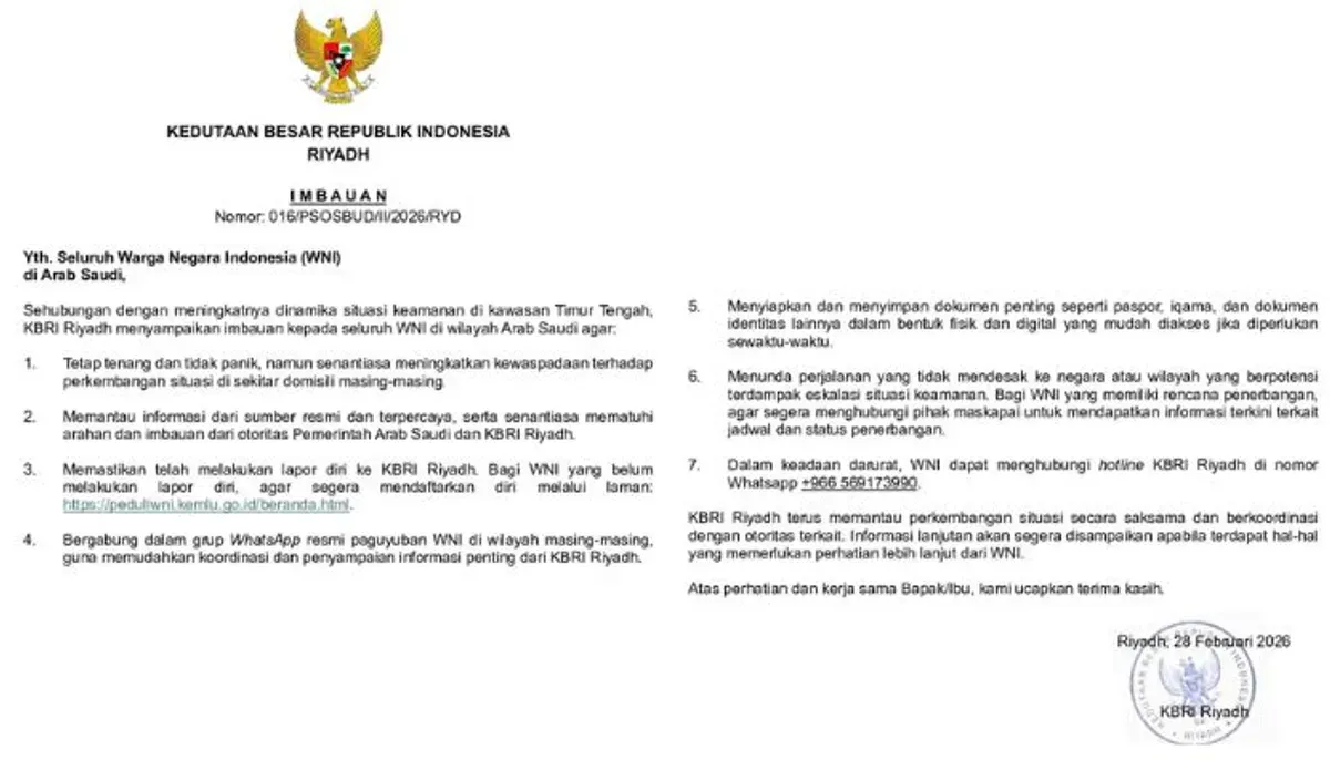 Berikut tujuh poin imbauan resmi KBRI Riyadh yang wajib diperhatikan WNI di wilayah Arab Saudi: