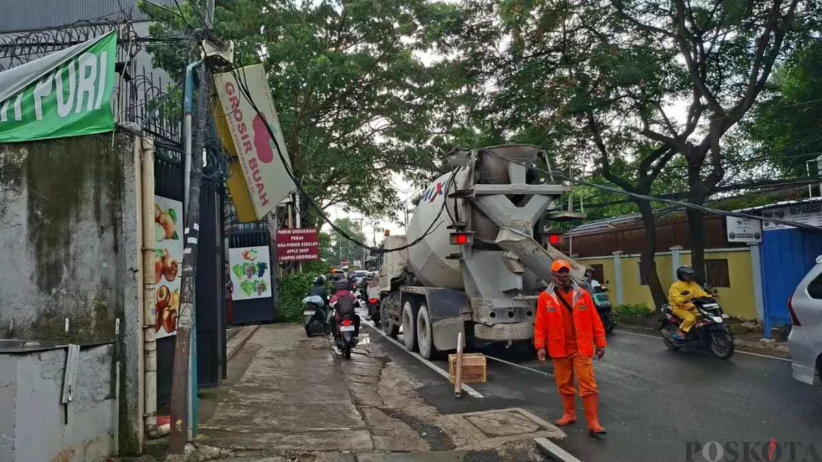 KEMBANGAN, POSKOTA.CO.ID - Truk molen yang sedang melintas di Jalan Puri Kembangan Raya, Kembangan, Jakarta Barat tersangkut kabel udara pada Selasa, 10 Maret 2026.