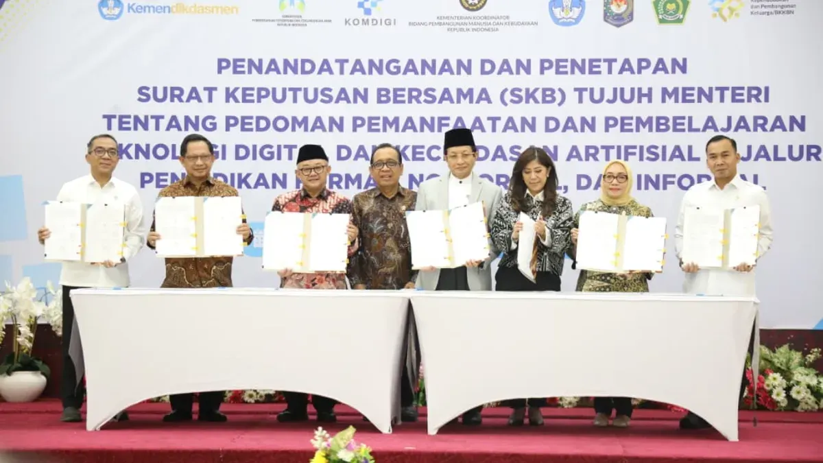POSKOTA.CO.ID - Menteri Dalam Negeri (Mendagri) Muhammad Tito Karnavian menandatangani Surat Keputusan Bersama (SKB) 7 Menteri terkait pedoman pemanfaatan teknologi digital dan kecerdasan artifisial di jalur pendidikan formal, non-formal, dan informal. Prosesi penandatanganan itu berlangsung di Aula Heritage, Kantor Kementerian Koordinator (Kemenko) Bidang Pembangunan Manusia dan Kebudayaan (PMK), Jakarta, Kamis, 12 Maret 2026