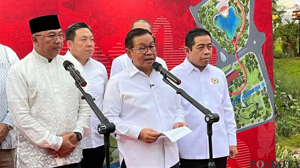 Gubernur Jakarta Pramono Anung saat menyampaikan pernyataan kepada awak media usai meresmikan Taman Bendera Pusaka di Kebayoran Baru, Jakarta Selatan, Sabtu, 14 Maret 2026. (Sumber: Poskota/M Tegar Jihad)