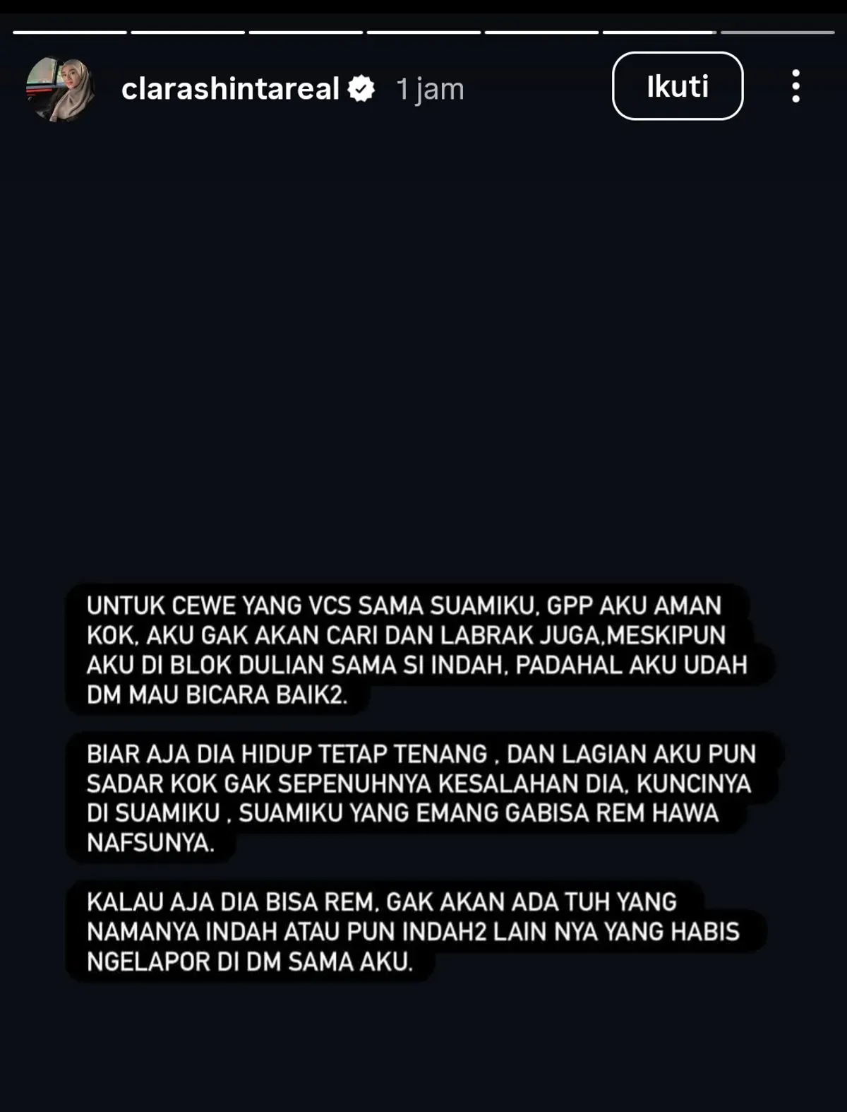 "Untuk cewek yang VCS sama suamiku. Gapapa aku aman kok. Aku gak akan cari dan labrak juga meskipun aku diblok duluan sama si Indah. Padahal aku udah DM mau bicara baik2," kata Clara.