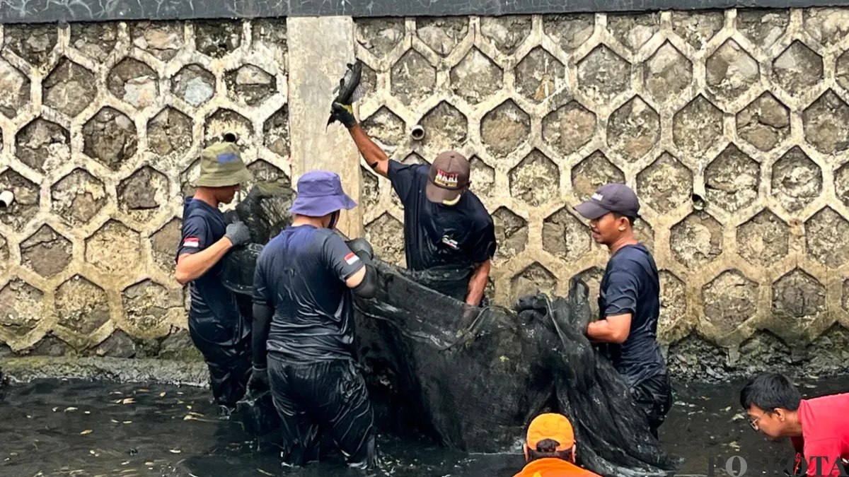 Petugas PPSU saat berburu ikan sapu-sapu  di aliran kali RW 06, Janur Elok VI Blok QD9, Kelapa Gading, Jakarta Utara, Jumat, 17 April 2026. (Sumber: Poskota/M. Tegar Jihad)