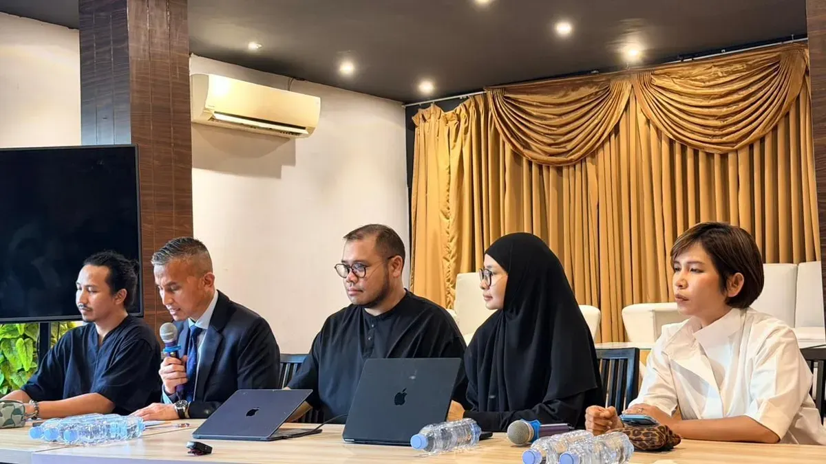 Ibrahim Arief didampingi istri dan tim kuasa hukum saat konferensi pers di Jakarta, 21 April 2026. (Sumber: Istimewa)