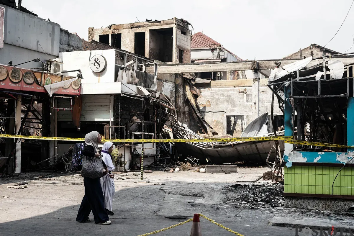 JAKARTA, POSKOTA.CO.ID - Warga mengamati area pusat jajanan serba ada (Pujasera) pascakebakaran di Jalan RS Fatmawati Raya, Gandaria Selatan, Jakarta, Senin, 8 September 2025.