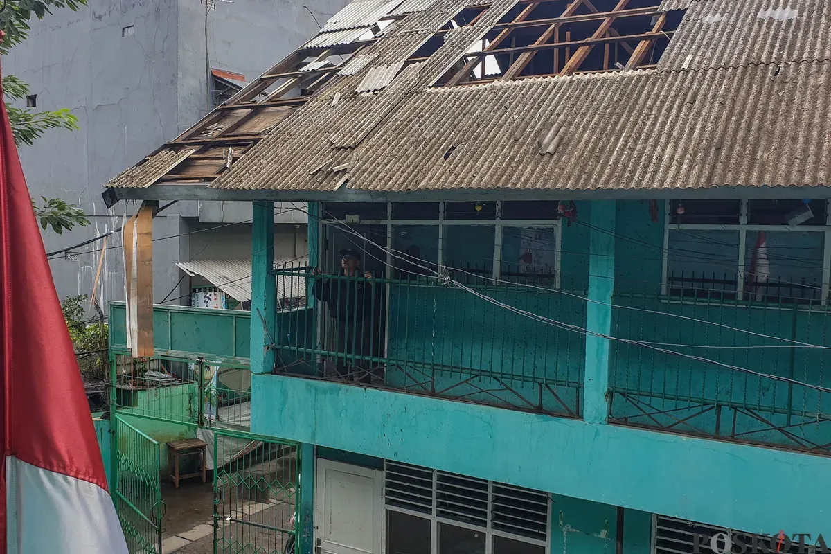 JAKARTA, POSKOTA.CO.ID - Petugas keamanan memeriksa bangunan yang hancur akibat angin puting beliung di Sekolah Dasar Islam (SDI) Baburidho, Kalibaru, Cilincing, Jakarta Utara, Selasa, 27 Januari 2026.