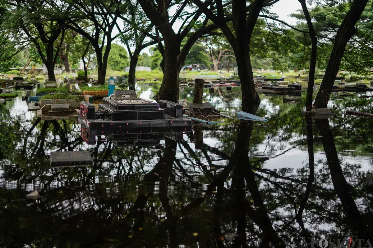 Selain itu lokasi TPU yang berada di kawasan rendah membuat area pemakaman terdampak limpasan air dari Kali Begog atau Kali Cakung Lama yang meluap. (Poskota/Bilal Nugraha Ginanjar)